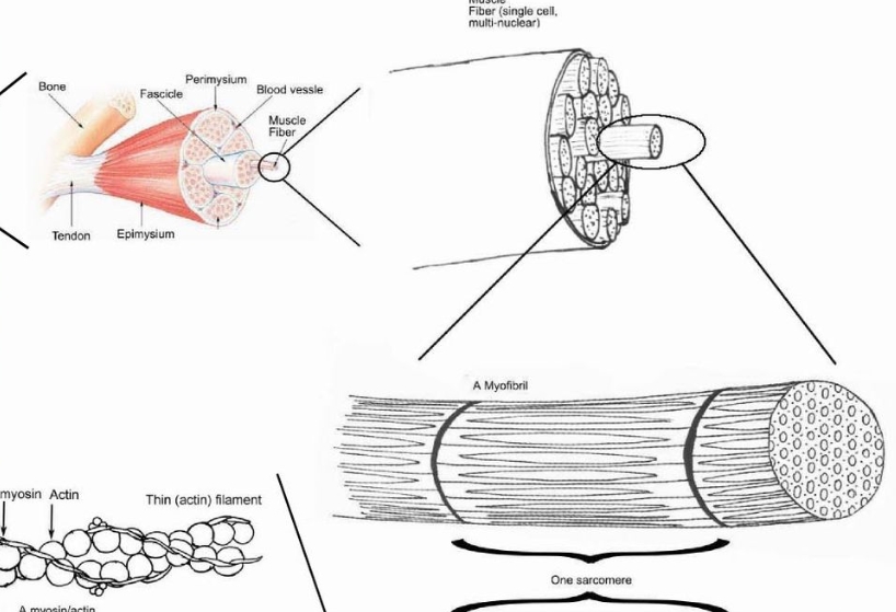 근육에는 크게 심근, 가로무늬근, 민무늬근 세 가지가 있습니다. 근 섬유는 굵은 정도가 20에서 100μm정도 됩니다. 안쪽에는 근원 섬유와 반유동성 물질로 이루어져 있고, 겉에는 근섬유막으로 되어 있습니다. 근원 섬유 사이에는 겔 형태의 근질로 이루어져 있으며 근수축 에너지가 만들어집니다.