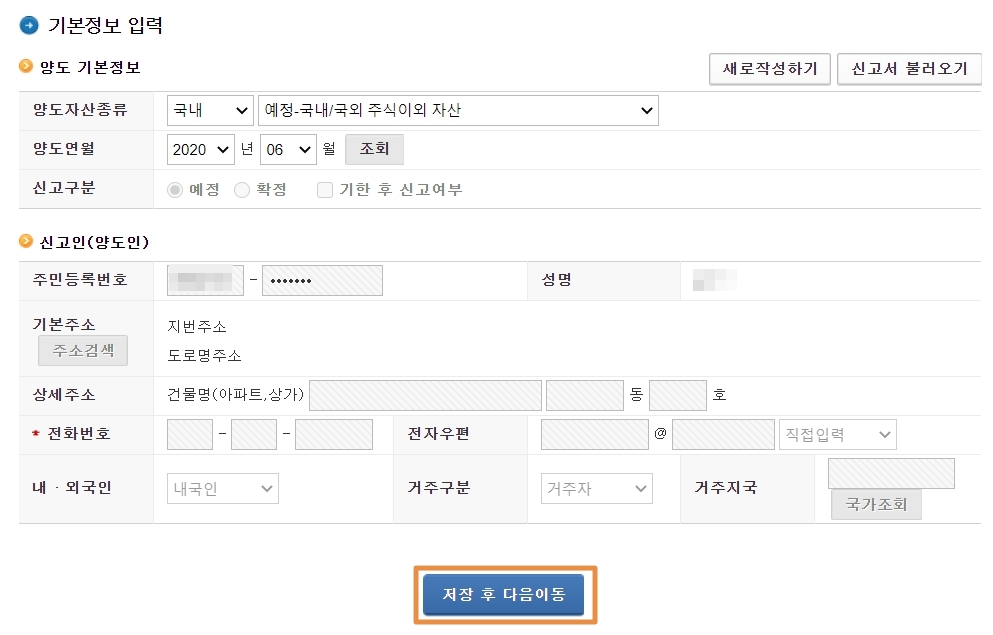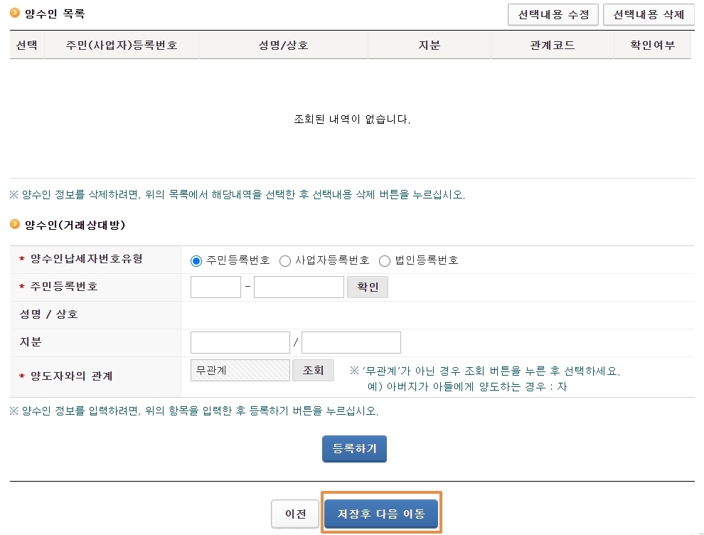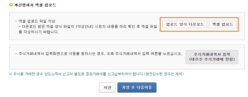 양도 년월, 양도 자산 종류를 입력해주시고 양도인의 연락처, 주소를 확인해 주신 후 '저장 후 다음이동'을 누릅니다. 양수인을 아는 경우 입력하시고 그렇지 않은 경우 '저장 후 다음이동'으로 넘어갑니다. 계산명세서를 입력하는 페이지가 나오는데, 밑으로 내려보시면 '계산명세서 엑셀 업로드'가 있습니다. HTS프로그램을 통해 이용하고 계시는 증권사에서 양도소득 과세자료 조회를 선택하시고 해당 년도를 조회해서 엑셀 파일로 저장합니다.