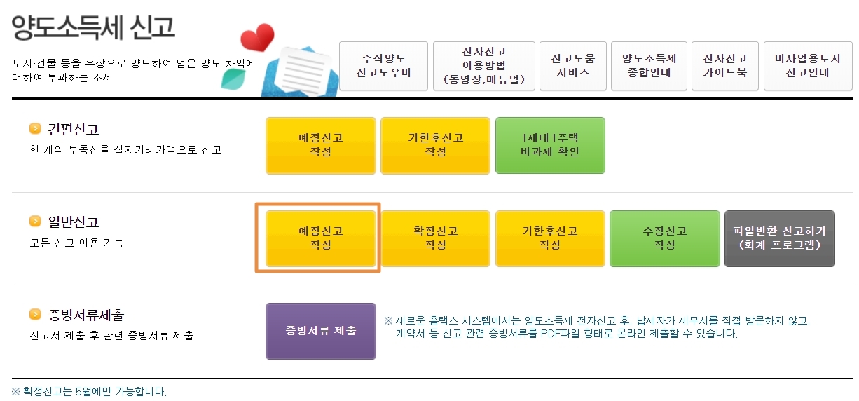 주식 양도소득세 신고 방법을 알아보도록 하겠습니다. 확정신고는 5월만 할 수가 있어서 예정신고 기준으로 알려드리겠습니다. 국내 주식과 국외 주식의 수익통산을 하는 경우에는 5월 확정신고기간에 실시합니다. 홈택스 홈페이지를 접속한 후 '신고/납부-양도소득세-예정신고 작성'으로 들어갑니다.