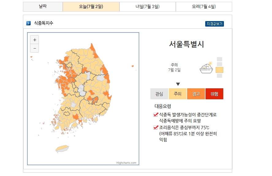 기상청에서는 식중독 지수로 식중독 주의 정도를 관리하고 있습니다. 습도와 기온을 연계해 식중독의 발생 가능 정도를 수치로 나타낸 것인데요. 기상청 날씨누리 홈페이지에서 생활기상정보-보건기상지수로 들어가시면 식중독지수를 확인하실 수 있습니다. 위험(86 이상), 경계(71에서 85), 주의(55 에서 70), 관심(55미만) 총 4가지의 단계로 구성되어 있습니다. 수치 55이상은 주의할 필요가 있겠네요. 가장 좋은 방법은 음식 섭취시 항상 조심하는 거겠죠. 여름 뿐만 아니라 겨울에도 식중독 가능성은 얼마든지 있으니 유의하시기 바랍니다.