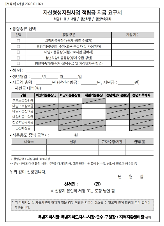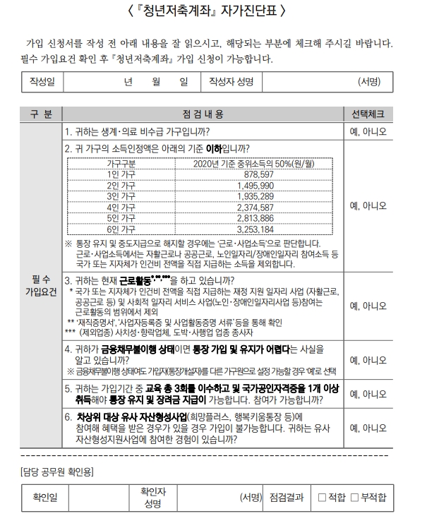청년 저축계좌를 신청하기 위해서는 관할 지역의 행정복지센터로 가셔서 본인의 도장과 신분증을 제출하고, 자가진단표를 작성한 후 신청을 하게 됩니다. 자가진단표 항목에서는 소득인정액이 기준치 이하 확인, 근로활동 여부 확인, 금융채무불이행 상태 확인, 저축계좌 장려금 지급시 국가공인자격증 취득과 교육 이수 참여 조건 확인, 생계/의료 비수급 가구 여부 확인을 하고 있습니다. (행복키움통장이나 희망플러스, 청년내일채움공제 같은 유사 사업에 참여한 이력이 있으면 가입이 되지 않는다고 하네요.)