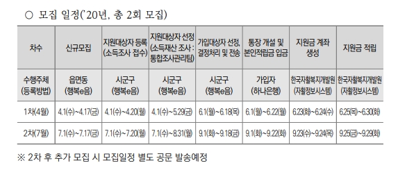 1차로는 4월달에 신청이 이루어졌었는데, 이번 2차 신청 기간은 7월 1일부터 17일까지입니다. 저축계좌에 대해 궁금한 사항이 있으면 행정복지센터나 보건복지상담센터(전화 129)로 전화하셔서 문의해보시면 되겠습니다.
