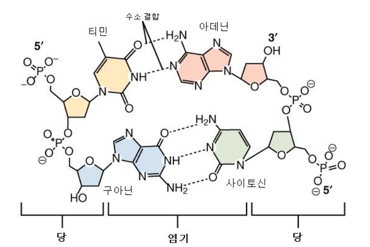 당은 염기와 1번 탄소가 있는 곳에서 글리코시드 결합을 이루고, 인산이랑 5번 탄소가 있는 곳에서 인산에스터 결합을 합니다. 두가지 모두 물을 만들게 됩니다. 뉴클레오티드 결합으로 사슬이 지속해서 생기게 됩니다. DNA는 염기를 통해 정보들을 담아두게 되고, 이중나선은 수소결합때문에 만들어지는 구조입니다.